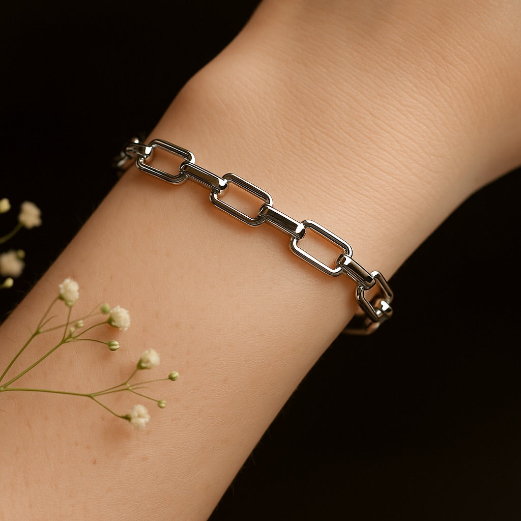 The Silver Link Luxe Bangle is versatile โ pair it solo for a minimal statement, stack it with your everyday essentials for a layered look, or let it stand out on its own as a bold centerpiece. This is the kind of jewelry that adapts to you, your vibe, and your mood.