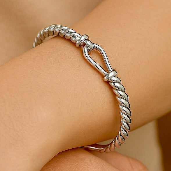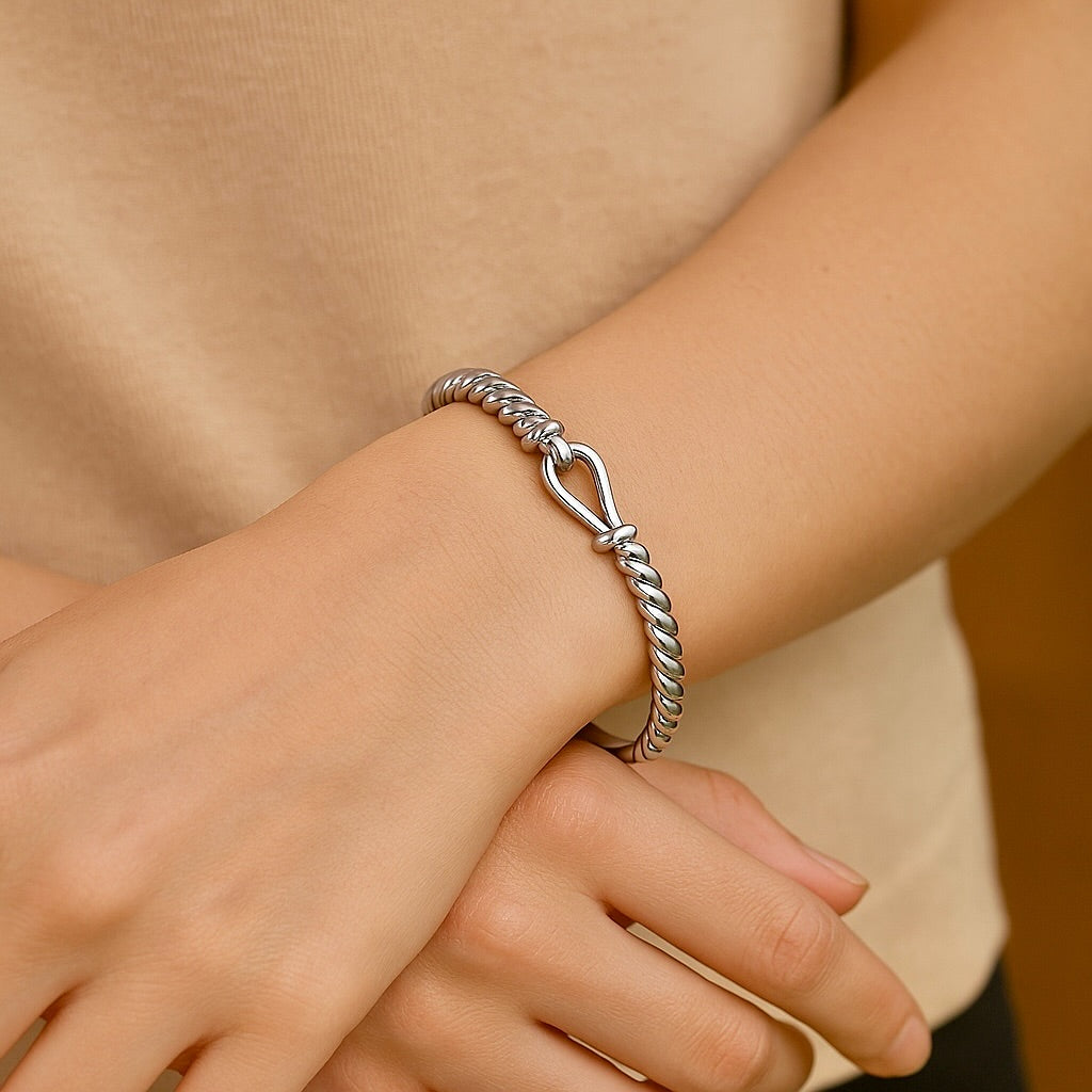 Redefine your accessory game with Nurayaโs Silver Twist Elegance Bracelet โ jewellery that speaks of style, strength, and grace.