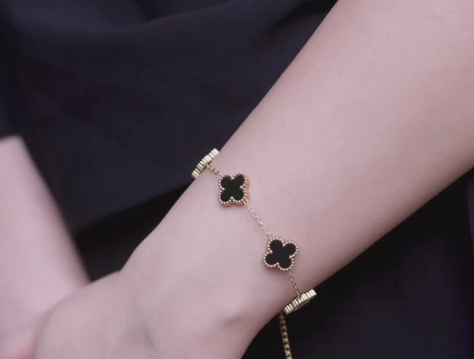 Introducing the Noir Clover Bracelet – a reversible beauty that lets you style it two ways – classy black clovers on one side & chic white clovers on the other. ✨