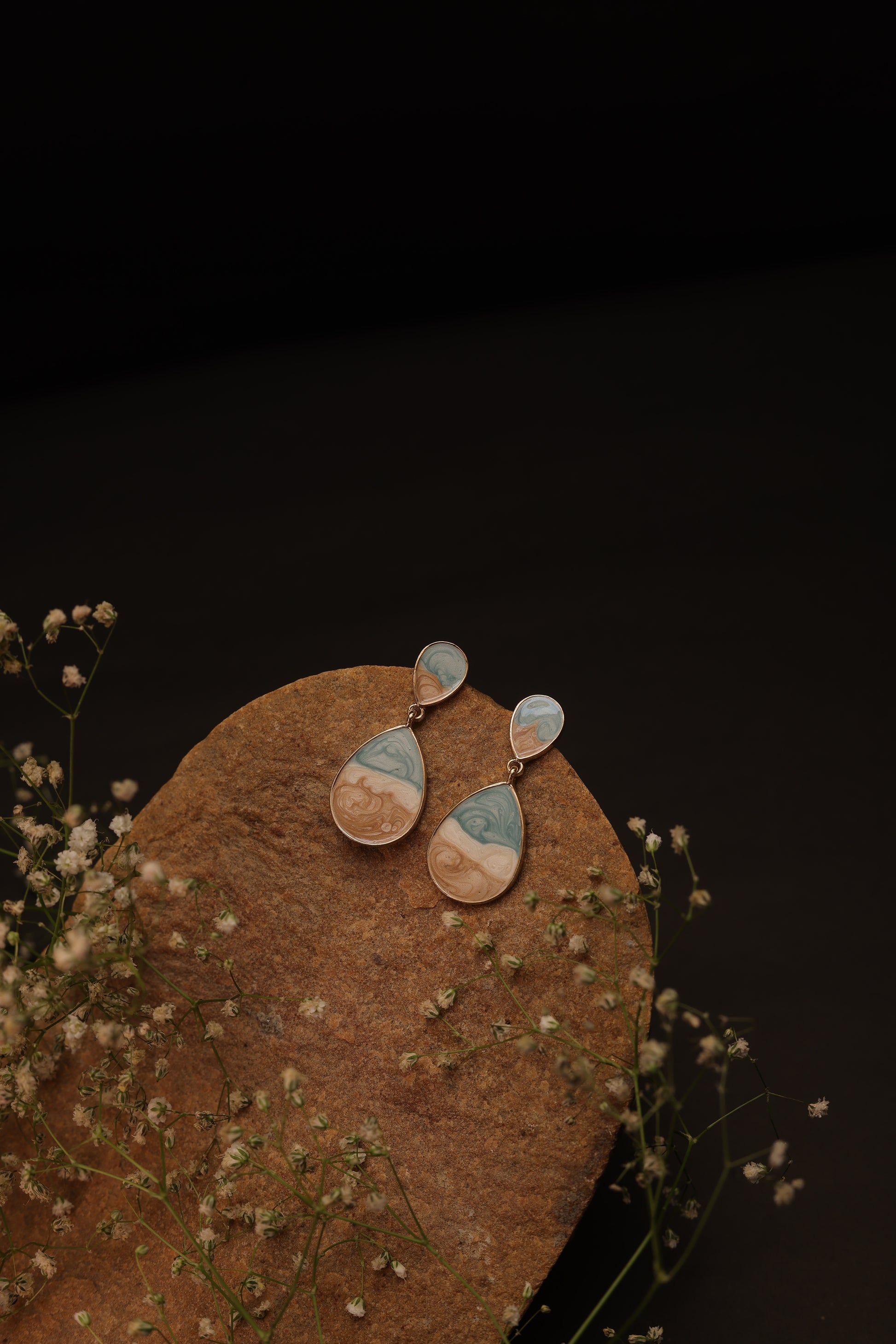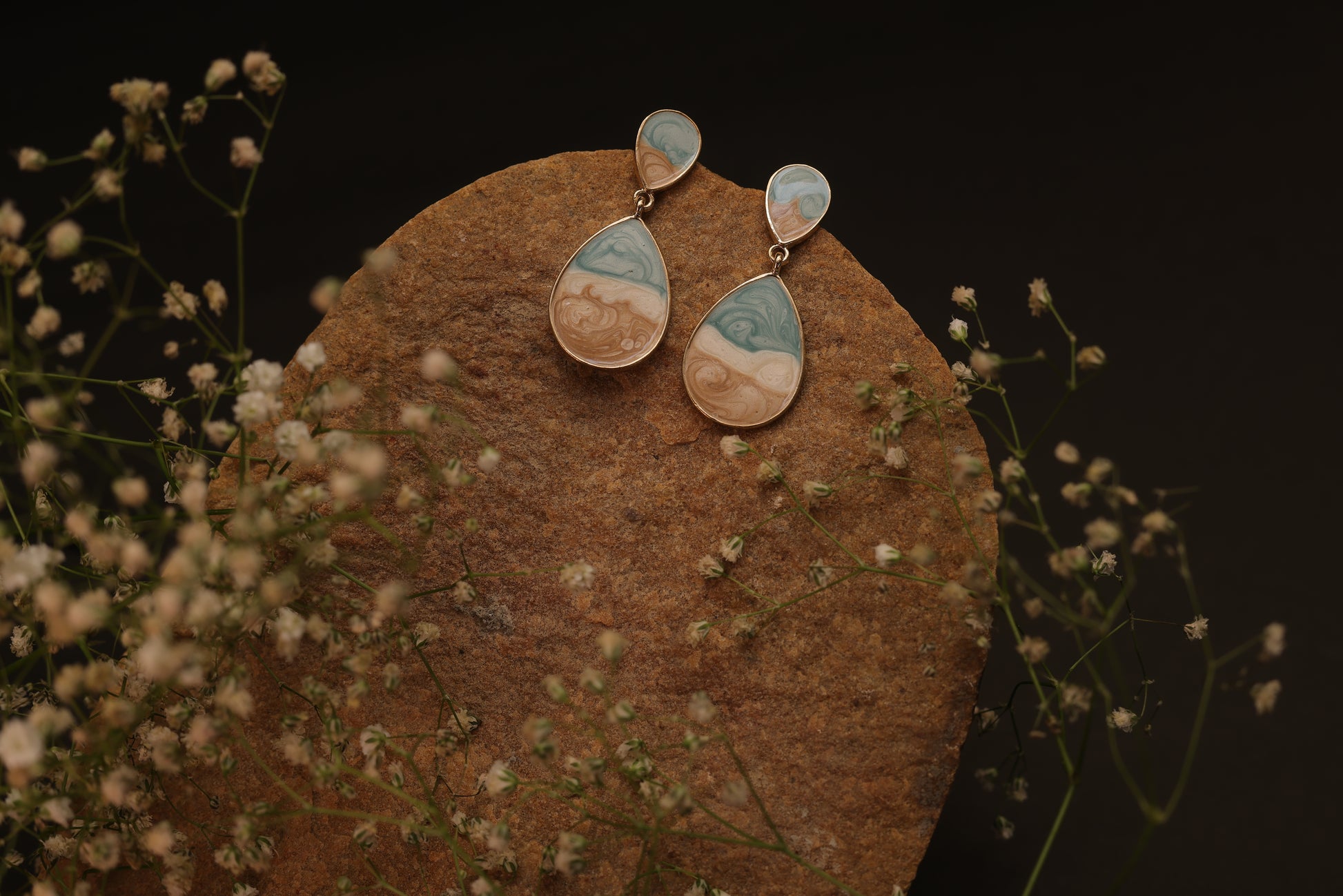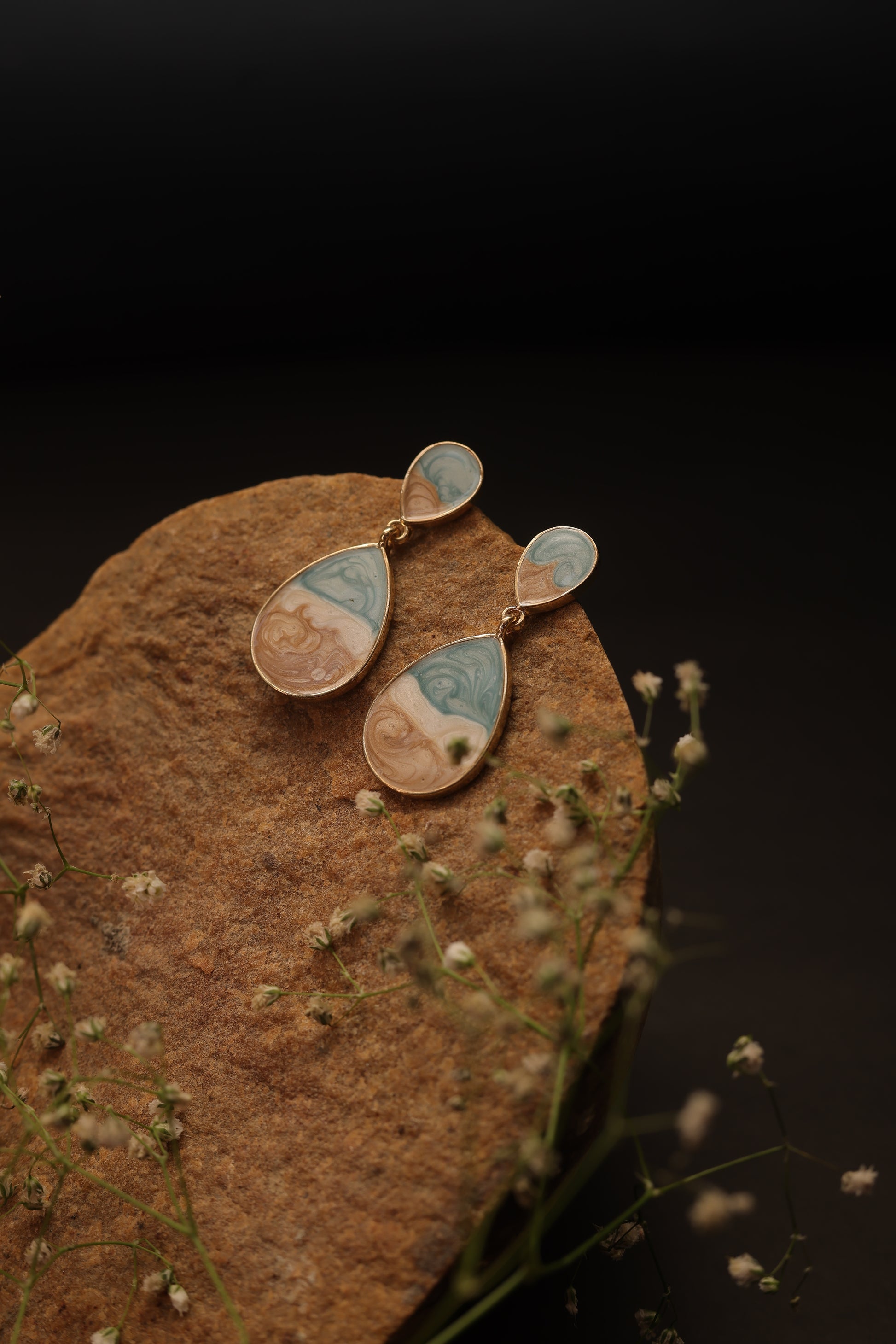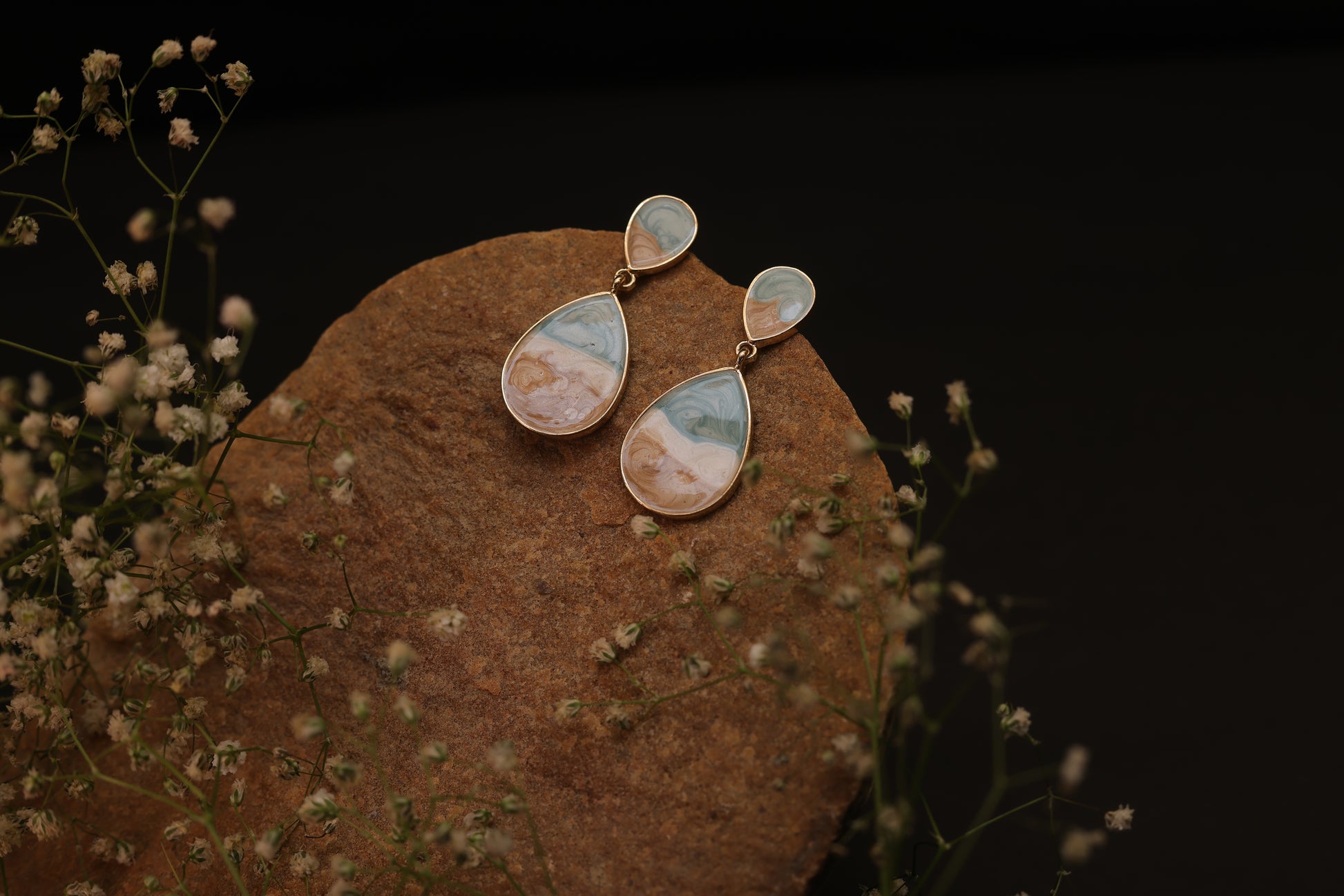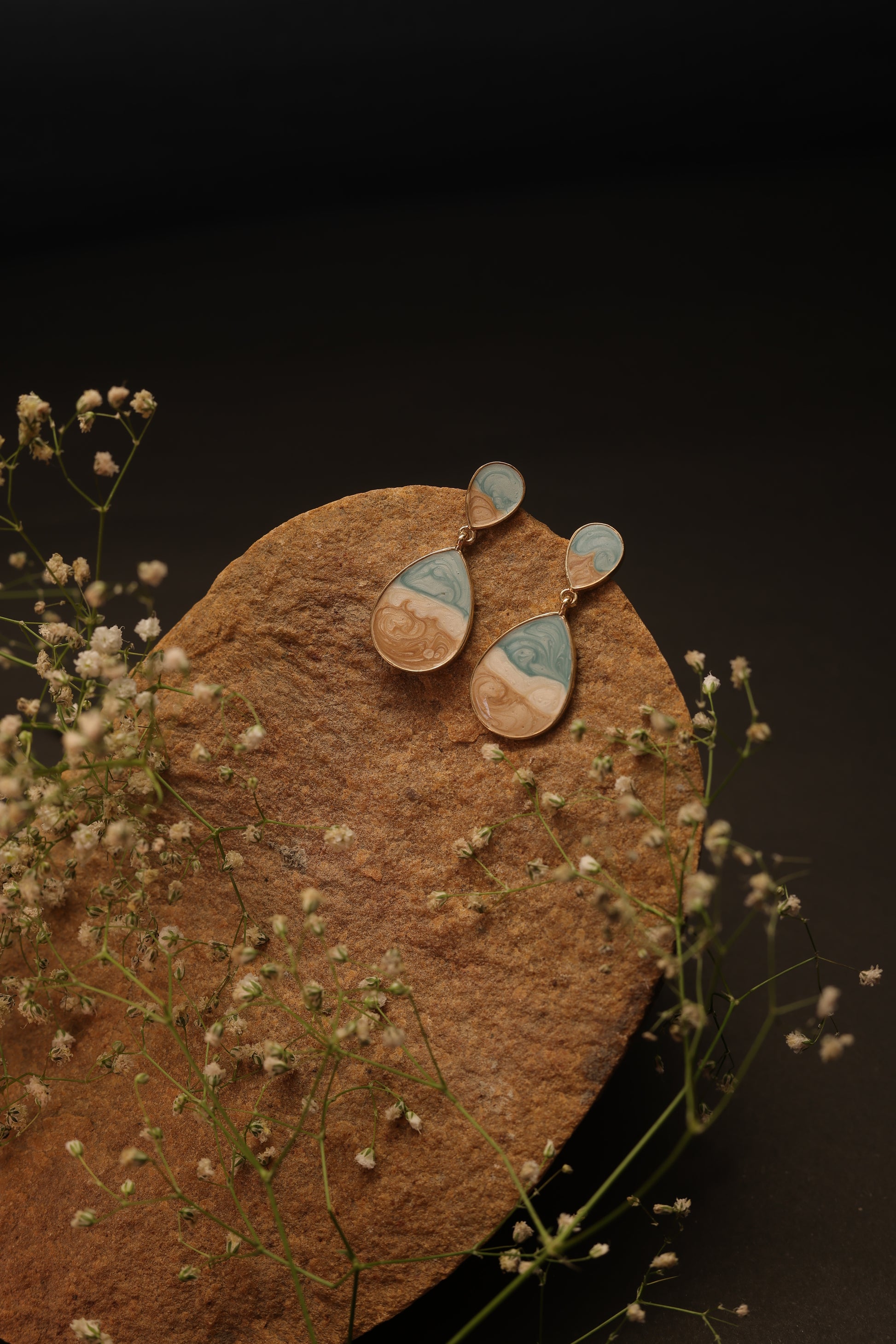 Artistic Marble Design – Unique swirls of aqua and sand tones give every piece a natural ocean-inspired look. •Anti-Tarnish Coating – Long-lasting shine that resists dullness and keeps its beauty intact. •Feather-Light Comfort – Crafted for effortless wear, perfect for long hours without discomfort. •Skin-Safe Material – Nickel-free & hypoallergenic, ensuring safe wear for sensitive skin. •Versatile Statement – Ideal for both casual elegance and festive occasions, adding a touch of uniqueness.