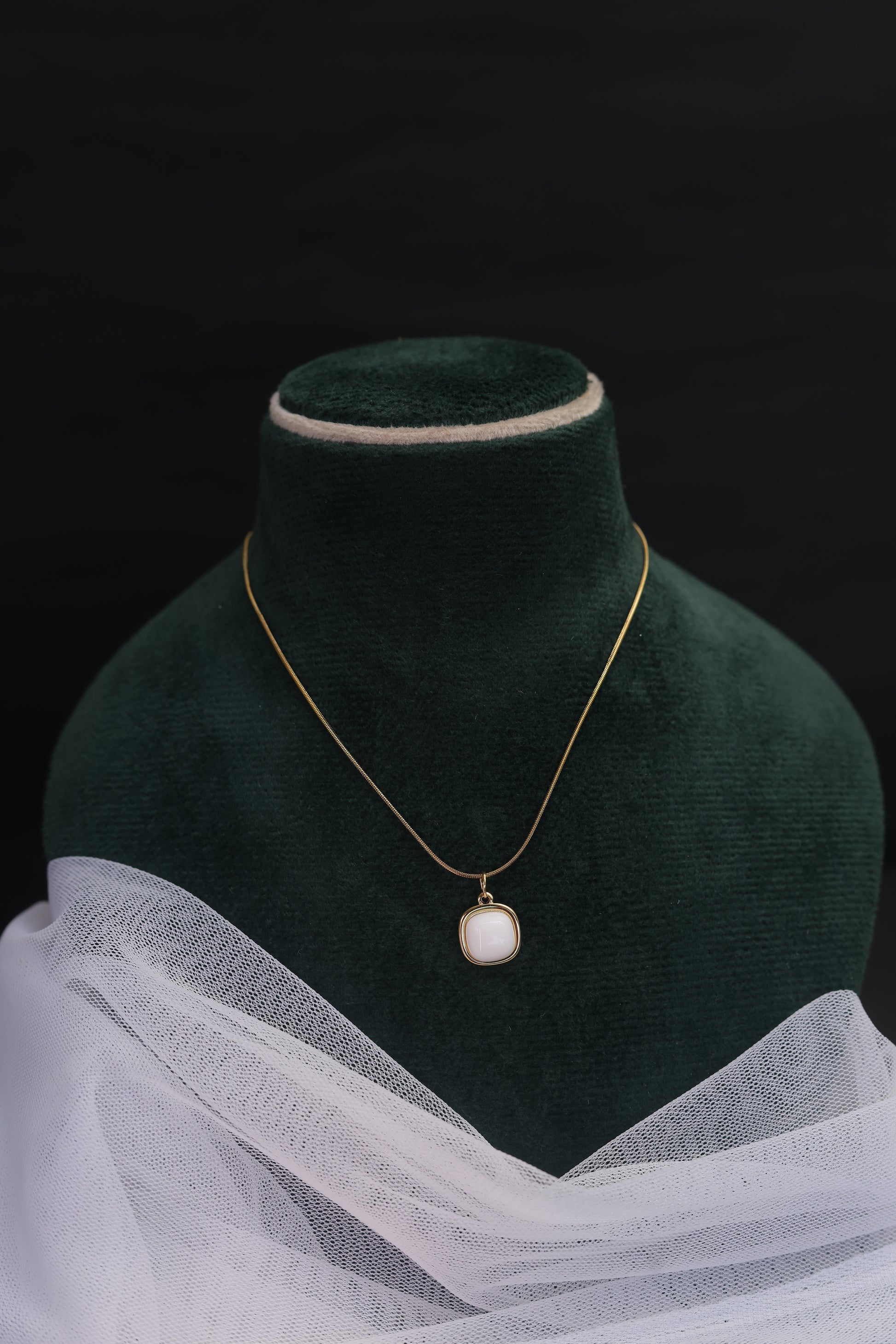 Elevate your look with minimal sophistication, featuring a smooth pearl-white pendant framed in a golden bezel for a touch of timeless elegance. Its protective anti-tarnish coating ensures the shine stays radiant and fresh for years.